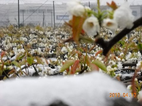 豊華梨が久々の4月開花となりました。交配を行ってから降雪(積雪)、豊水満開の中の出来事でした、梨栽培をしている大先輩によると、50年も前にあったようです。8月になってからの降雹、45分もつづき、気持ちも沈んだ1年になりました。その後連続猛暑日。健康で日々の仕事を乗り切るのが、精一杯の夏になりました。梨の食味も品種によっては今いちで、梨農家泣かせの1年になってしまいました。